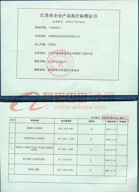 產(chǎn)品執(zhí)行標(biāo)準(zhǔn)證書